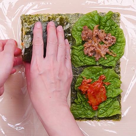 ラップに焼のりをのせ、左下に1・残りの3か所に具材をのせる。