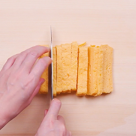 厚焼玉子は5mm厚さに切る。サンチュは半分に切る。