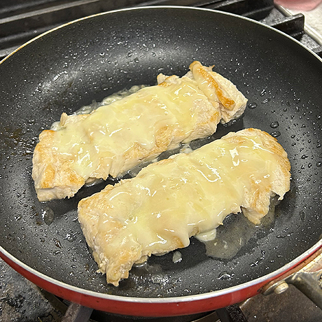 5の鶏肉をフライパンに戻し入れてチーズをのせ、蓋をしてチーズがとろけるまで加熱する。