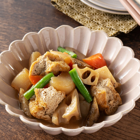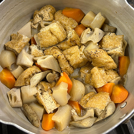 手順2鍋に水・和風だしの素・れんこん・ごぼう・人参・こんにゃくを入れて火にかける。煮立ったらaの調味料・とちお油揚げを入れ、煮汁が半分になるまで煮含める。