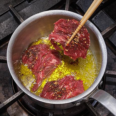 牛肉の旨みをオイルに閉じ込めた、スパイシーアヒージョ。
