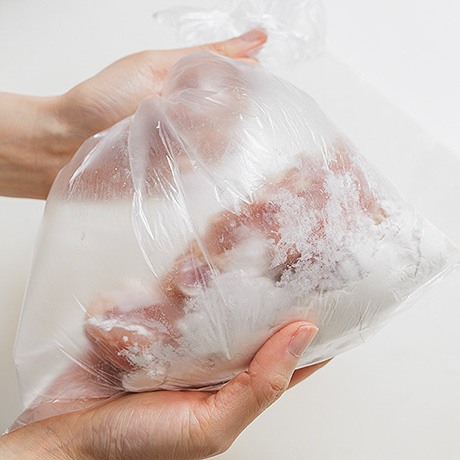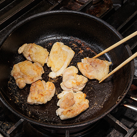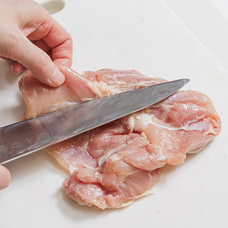 鶏肉は厚みを均等にして、食べやすい大きさに切る。