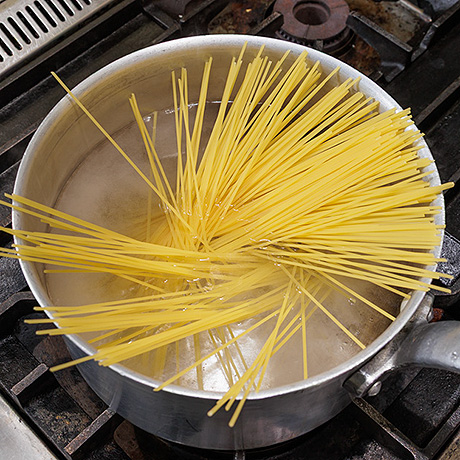 スパゲッティは表示通りゆでる。サラダ油で炒め、塩・こしょうする。