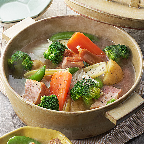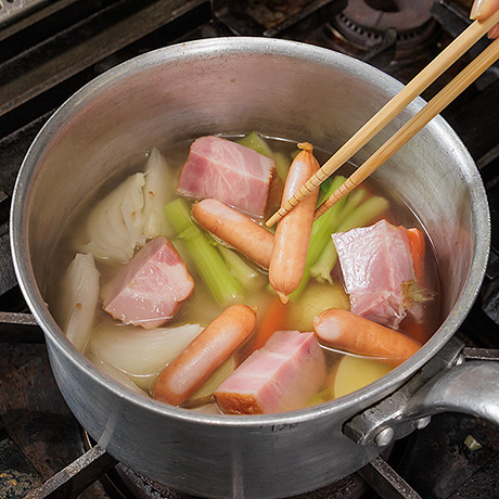 手順5沸騰したらウインナー・ベーコンを入れ、15分ほど野菜に火が通るまで煮る。