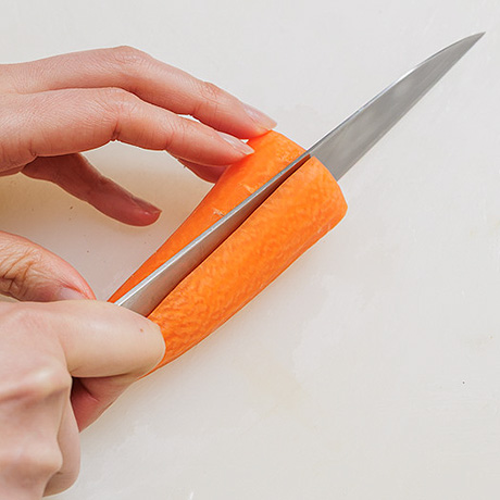 手順1-1じゃが芋はひと口大に切る。人参は半分の長さに切って縦半分にする。玉ねぎはくし形に切る。