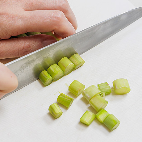 手順1アスパラガスは根元の皮をむいて小口切りにする。玉ねぎは粗みじん切りにする。