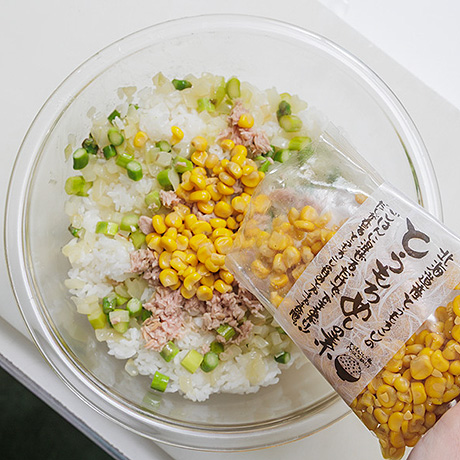手順4温かいごはんに2・3・とうもろめしの素を入れて混ぜ込み、黒こしょうをふる。