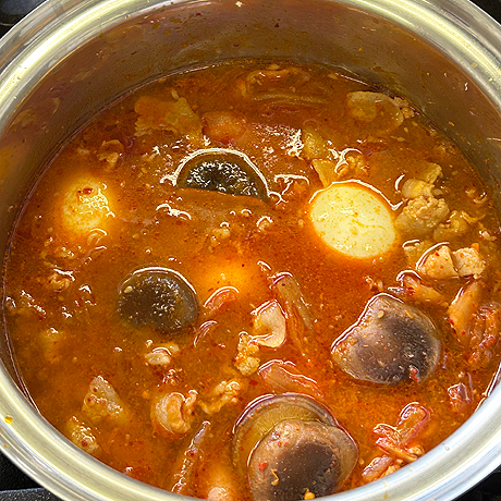 手順4鍋にごま油を温め、豚肉を炒める。豚肉の色が変わったらキムチを入れて炒める。aを加えてさっと炒め、 bを入れる。椎茸・ウインナー・ゆで卵を入れて煮る。火が通ったら、長ねぎ・にらを入れてさっと煮る。