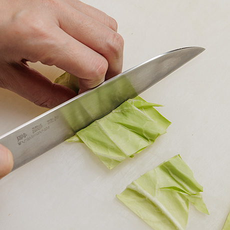 手順1-1キャベツは3cm角に切る。玉ねぎは薄切りにする。