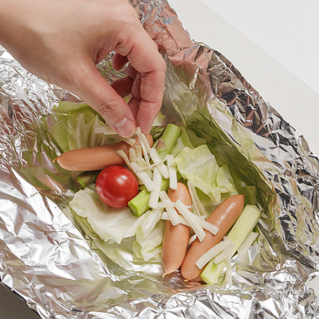 手順2アルミホイルに1・無塩せきソーセージ・ミニトマト・チーズの半量をのせて塩・こしょうして包む。同様にもう1個作る。