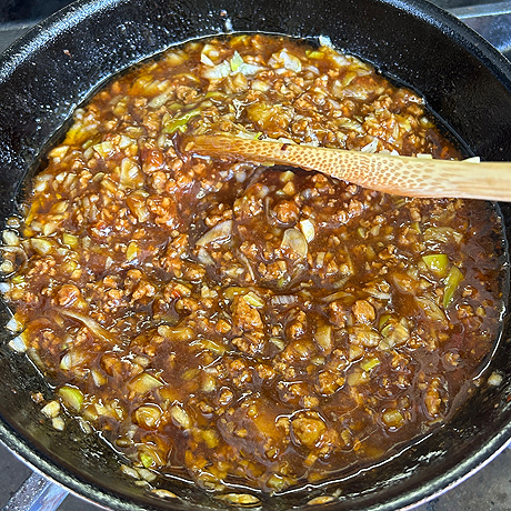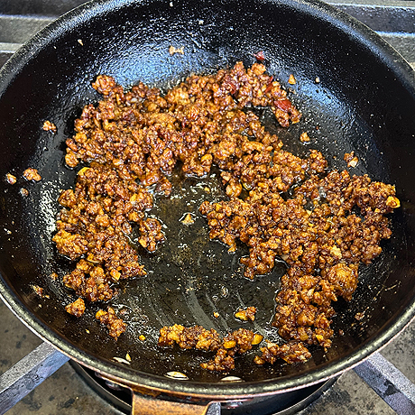 手順2フライパンにサラダ油を温め、豚挽き肉を炒める。火が通ったらにんにく・豆板醤・甜面醤を入れて中火で炒める。