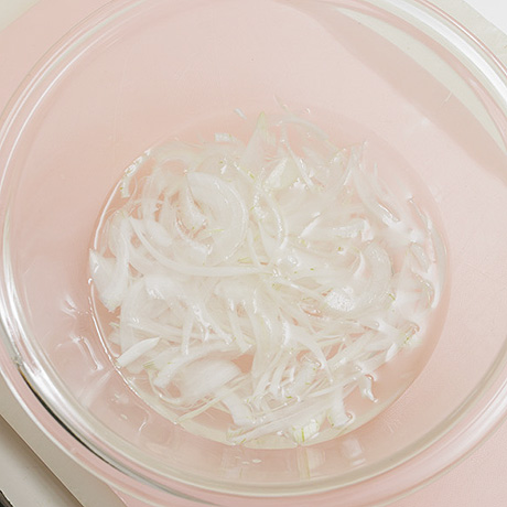 手順1-2玉ねぎは薄切りにして水にはなす。