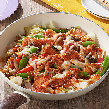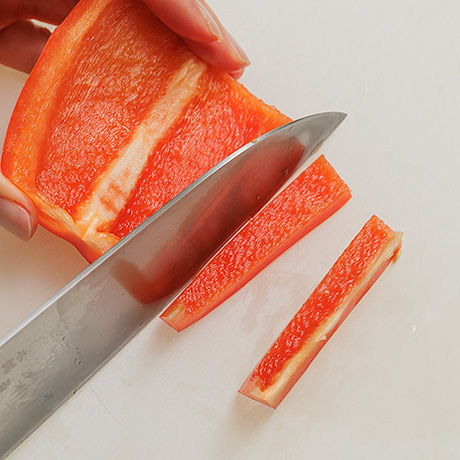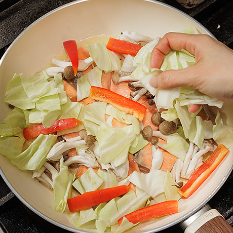 手順2キャベツ・玉ねぎはひと口大に切る。パプリカは1cm幅に切る。しめじは石突をとり、小房に分ける。