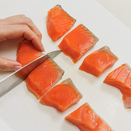 手順1サーモンは4等分に切り、塩・酒をふる。