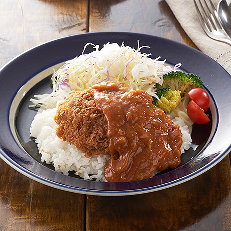 器にごはんを盛り付け、温めたTHEメンチカツをのせ、4をかける。キャベツミックス・ブロッコリー・ミニトマトを添える。
