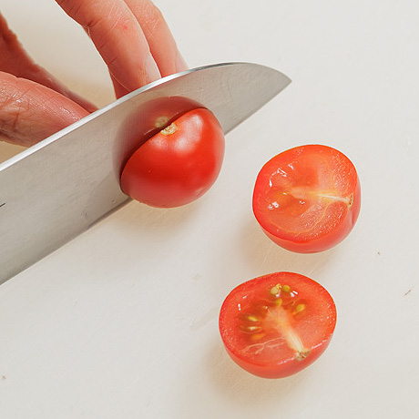 ブロッコリーはゆでる。ミニトマトは半分に切る。
