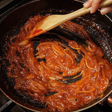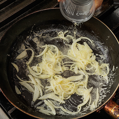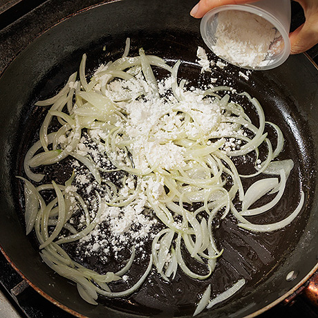 フライパンにバターを温め、玉ねぎを炒める。透き通ってきたら薄力粉を入れて炒める。